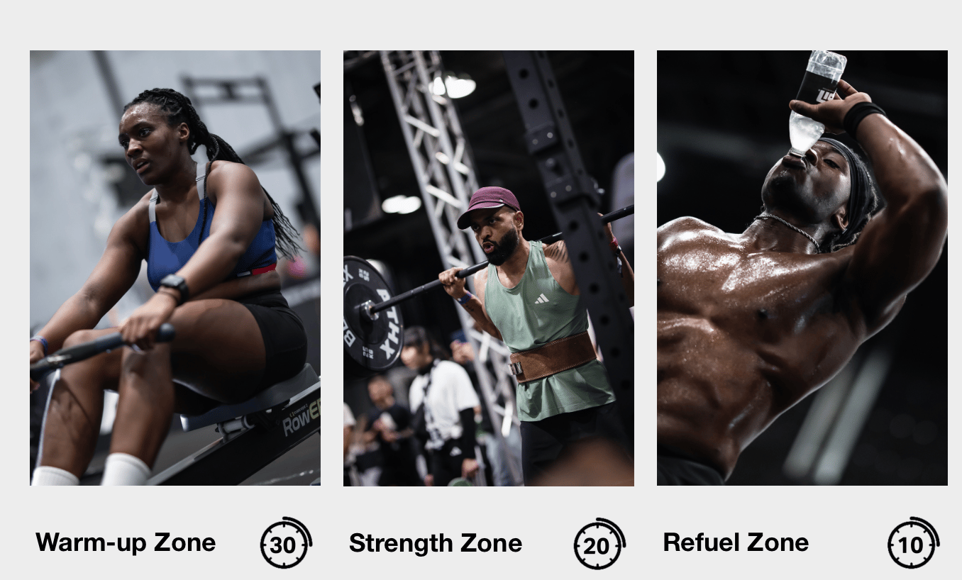 Contrairement à HYROX, où l’athlète évolue dans un flux continu, ATHX impose une progression segmentée. Chaque phase est bornée dans le temps, ce qui limite les écarts logistiques et homogénéise l’expérience athlète.